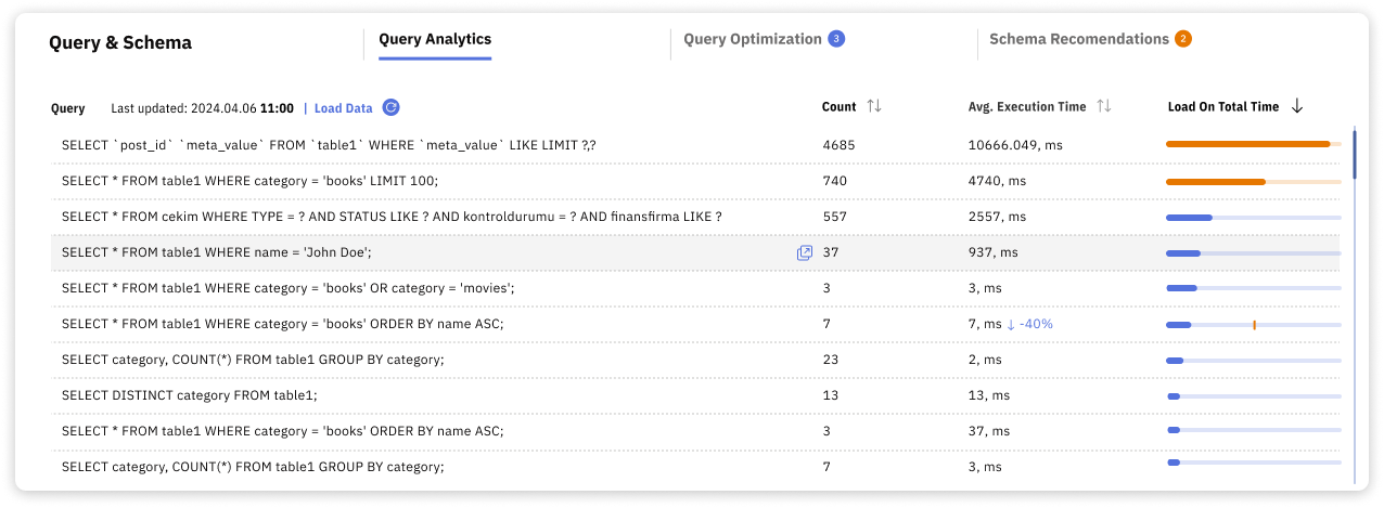 - Load on total time shows the total time spent executing the query, combining execution time and frequency.
